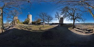 Burg Hohennagold im Frühjahr. Interaktiv kann auch eine kleine „Miniwelt“ erzeugt werden. Einfach Rechts-klick und dann „Planet View“ auswählen.