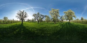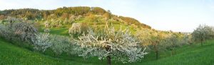 Kirschblüte in Kayh am Schönbuchrand. Ein Teilpanorama empfiehlt sich, wenn ein bestimmter Bereich nicht gezeigt werden soll. So wird der Augenmerk des Betrachters auf das Gewünschte fokussiert.